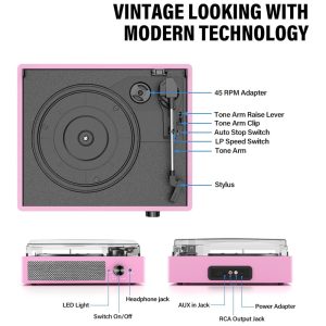 Toca-discos para Vinil com Alto-falantes Bluetooth Design Elegante em Rosa Claro – WOCKODER
