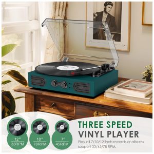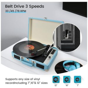 Toca-discos Hododou Vinyl Record Player Portátil com Bluetooth 3 Velocidades e Gravação USB – Alto-falantes Integrados – Azul