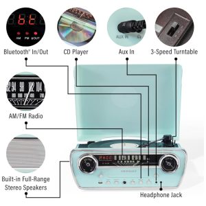 Vitrola Toca-Discos Powel 7 em 1 Bluetooth com Rádio AM/FM CD Player e Aux-in CR6047A-AB Crosley Azul Aqua