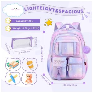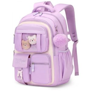 Mochila FENGDONG roxa para adolescentes estilo kawaii com laço e pompom para notebook até 156″