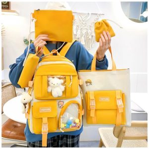 Mochila HORHREAR Kawaii 5 em 1 escolar transparente com pelúcia e estojo bege/tons colorblock