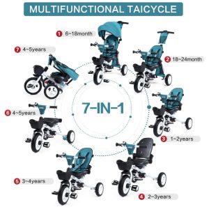 Triciclo Infantil Dobrável 7 em 1 com Alça Ajustável Arnês de Segurança Freios de Roda Capota Removível e Armazenamento JMMD Verde
