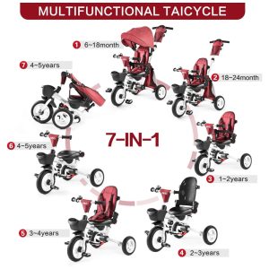 Triciclo Infantil Dobrável 7 em 1 com Alça Ajustável Arnês de Segurança Freios de Roda Capota Removível e Armazenamento JMMD Vermelho