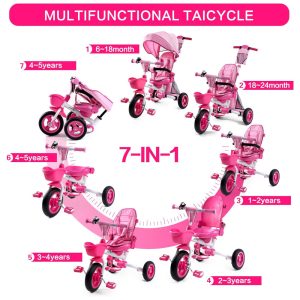 Triciclo Infantil Dobrável 7 em 1 com Alça Ajustável Arnês de Segurança Freios de Roda Capota Removível e Armazenamento JMMD Rosa