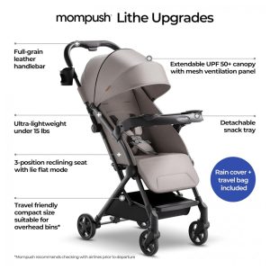 Carrinho de Bebê para Passeio Dobrável Ultracompacto com Assento Reclinável Porta Copos Bolsa de Viagem e Capa de Chuva Mompush Lithe V2 Bege
