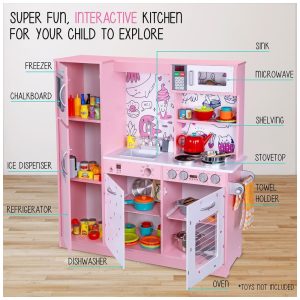 Cozinha Infantil em Madeira com Micro-ondas Máquina de Gelo a Bateria e Som Realista Lil Jumbl Rosa