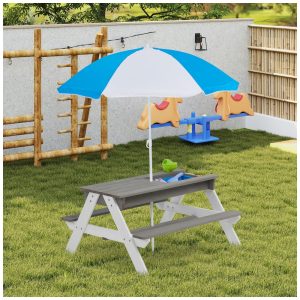 Mesa Infantil 3 em 1 para Brincar com Areia e Água Inclui Guarda Sol Ideal para Ar Livre SoliWood