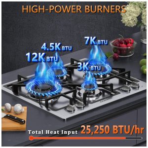 Fogão Cooktop a Gás 4 Queimadores VEVOR Inox Preto Conversível GN/GLP 48.000 BTU 110V Embutir 76cm