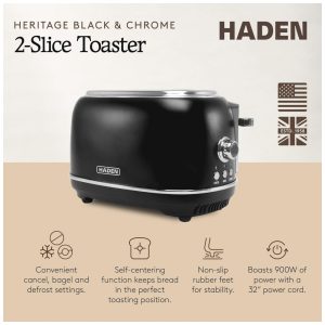 Torradeira HADEN Starbeck 2 fatias preta e cromada com fenda larga e 7 níveis de tostagem 1600W 110V