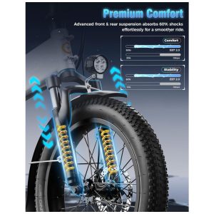 Bicicleta elétrica dobrável Jasion Hunter Pro azul meia-noite pneu grosso 20″ motor 1000W pico 1800W bateria 48V 15Ah até 128 km 110V