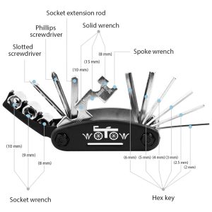 Kit de Reparo Emergencial de Bicicleta e Bolsa de Transporte 17 Funções YBEKI Preto
