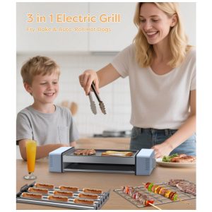 Máquina de Rolos Elétrica 3 em 1 para Cachorro-Quente: Compacta Churrasqueira Interna com 6 Rolos Removíveis Antiaderentes para 9 Salsichas – RAIQEE