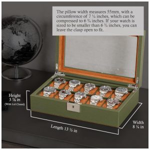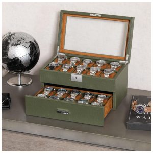 Caixa Estojo de Couro e Tampo de Vidro para Relógios com 20 Compartimentos ROTHWELL Verde e Marrom