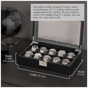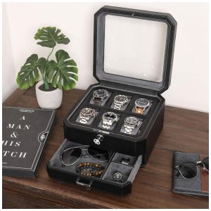 Caixa Estojo de Couro e Tampo de Vidro para Relógios com 6 Compartimentos ROTHWELL Preto