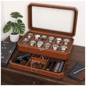 Caixa Estojo de Couro com Gaveta de Manobrista para Relógios com 12 Compartimentos ROTHWELL Marrom