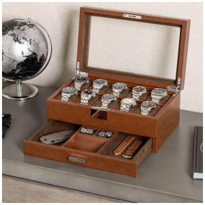 Caixa Estojo de Couro com Gaveta de Manobrista para Relógios com 10 Compartimentos ROTHWELL Marrom