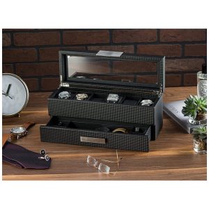 Caixa Estojo de Fibra de Carbono e Visor de Vidro para Relógios com 6 Compartimentos Glenor Co Preto