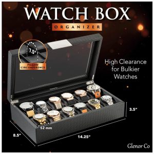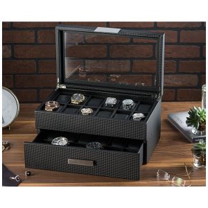 Caixa Estojo de Fibra de Carbono para Relógios com 14 Compartimentos Glenor Co Preto