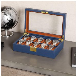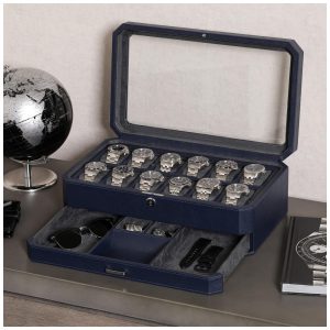 Caixa Estojo de Couro para Relógios com 12 Compartimentos ROTHWELL Azul