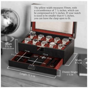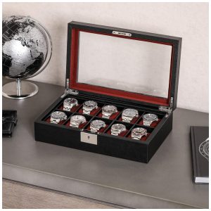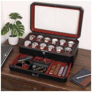 Caixa Estojo de Couro e Tampo de Vidro para Relógios com 20 Compartimentos ROTHWELL Preto e Vermelho