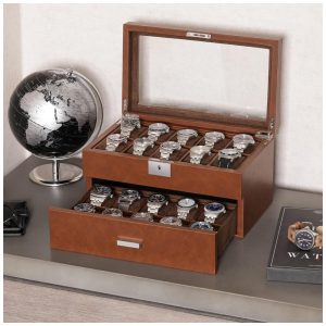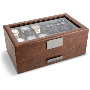 Caixa Estojo de Couro e Tampo de Vidro para Relógios com 20 Compartimentos ROTHWELL Marrom