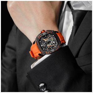 TSAR BOMBA Relógio Masculino Automático Esqueleto Mecânico Luxuoso à Prova d’Água 50M Estilo Quadrado Laranja