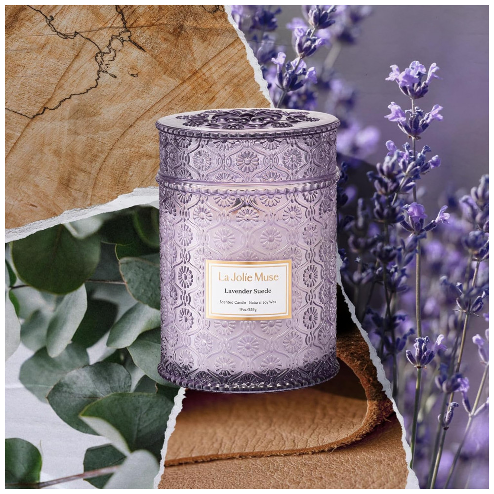 Vela de Lavanda e Camurça LA JOLIE MUSE Eucalipto, Lavanda e Sândalo 539g com Pavio de Madeira – Cera de Soja Natural – 90 Horas de Queima Limpa – Aro