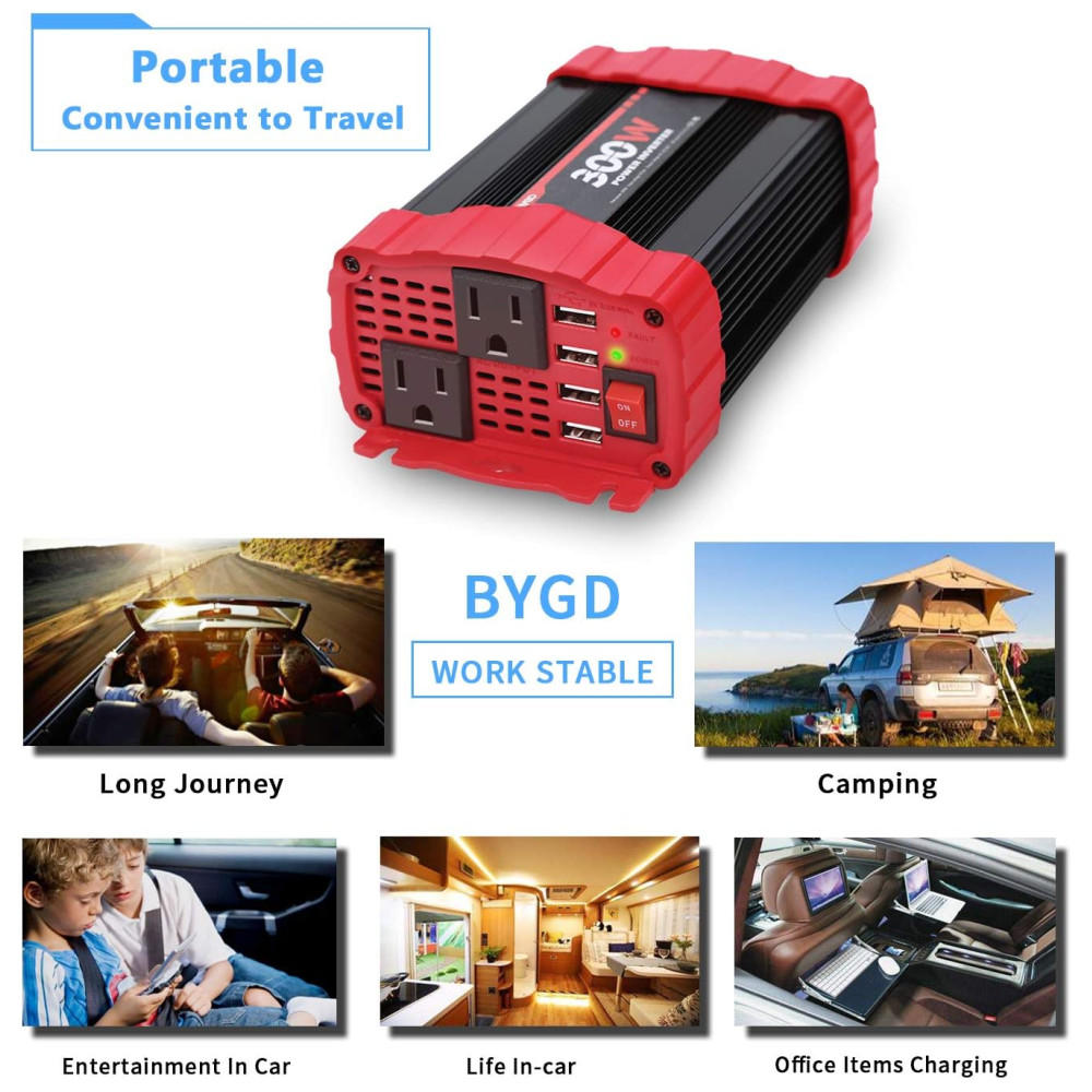Vantagem BYGD inversor de energia para carro premium de 300 W com 2 tomadas CA e 4 portas USB de carregamento rápido de 3,1A. Fornece velocidade máxima e energia contínua estável para dispositivos de carregamento, ele resolverá o problema de energia para sua longa jornada, camping, entretenimento automotivo e emergência .