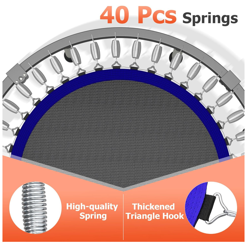 O mini trampolim HYD-Parts de 48 polegadas apresenta estrutura fabricada em aço inoxidável, garantindo resistência à corrosão e durabilidade. Conta com 40 molas de alta elasticidade revestidas por capa protetora para segurança e preservação do mecanismo elástico. O tapete de salto é antiderrapante e confeccionado em material resistente, assegurando estabilidade e funcionalidade ao usuário.