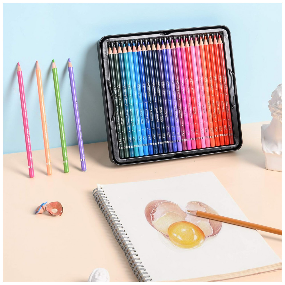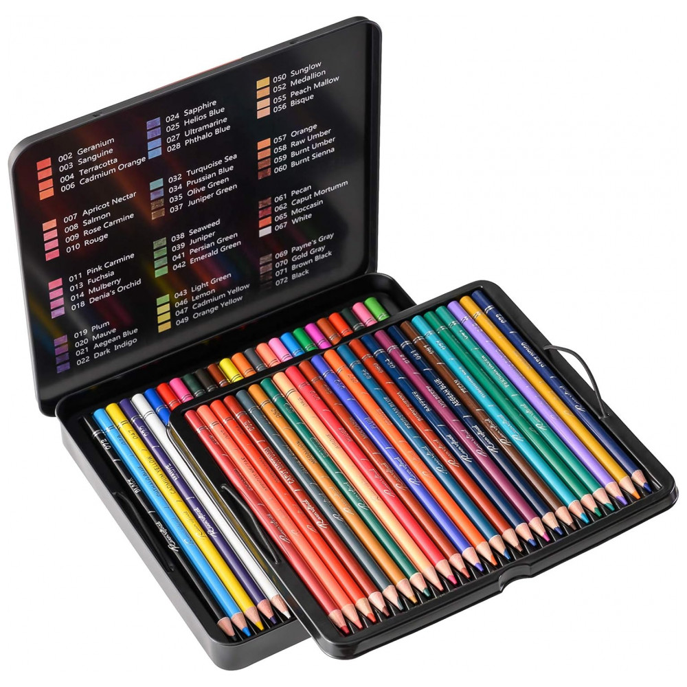 Os lápis de cor ‘Artist Grade’ possuem uma proporção maior de pigmento, resultando em cores mais ricas e vibrantes. Além disso, são mais resistentes à luz e mais macios, facilitando a utilização e mistura. Com certificação ASTMD4236, são seguros e não tóxicos, livres de alérgenos comuns. A embalagem em caixa de metal de alta qualidade e os compartimentos internos proporcionam um bom espaço para armazenar e selecionar as cores. Ideal como presente para amigos e crianças em feriados como Ação de Graças e Natal. Inclui 48 lápis de cor premium.