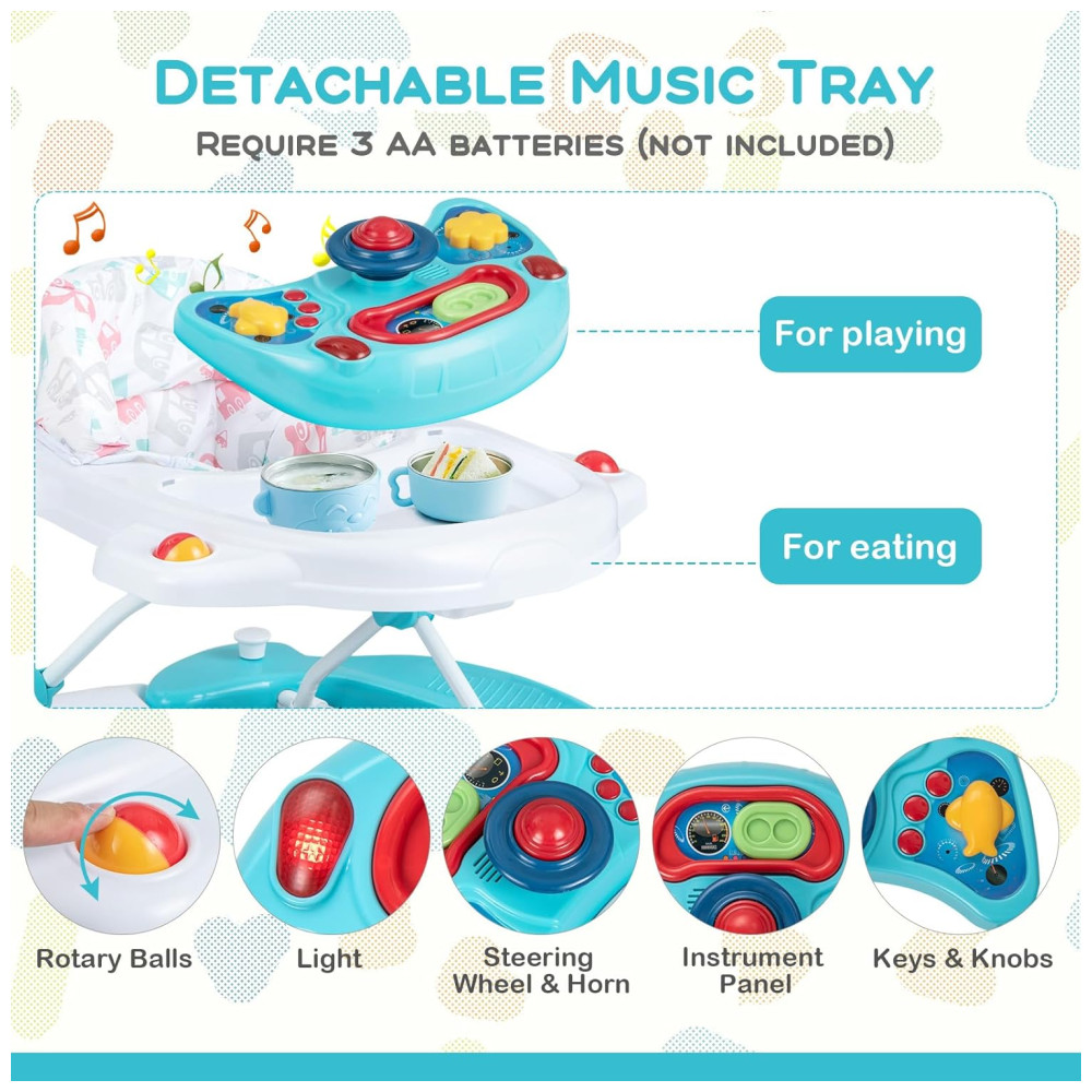 Além disso, depois de remover a caixa de música, pode ser transformada em um caminhante com bandeja de comida para refeições de babys