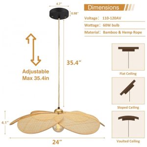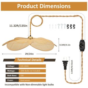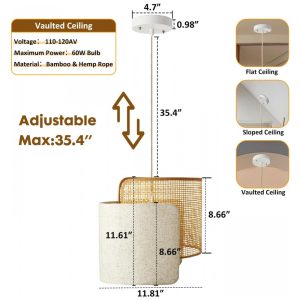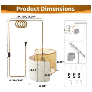 BAMWUAN Luminária Pendente Boho com Dimmer Contínuo e Cúpula de Linho e Bambu – 342m Cordão Plug-in