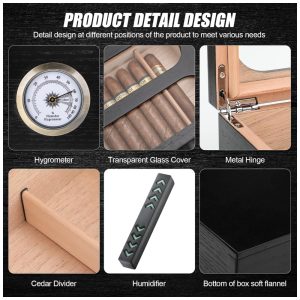 Umidor de Charutos Premium com Controle de Umidade COOL KNIGHT – Higrômetro Frontal Umidificador e Gavetas de Acessórios em Vidro Temperado