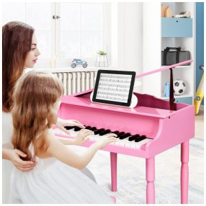 Piano Clássico Infantil com 30 Teclas Banco e Tampa de Piano para Crianças de 3 a 8 Anos Goplus Rosa