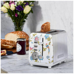 Torradeira 2 Fatias em Aço Inox Laura Ashley Branco com estampa floral Elveden Slots Largos 7 Níveis Funções Descongelar Reaquecer Rack para Croissants 850W 110V