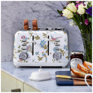 Torradeira 4 Fatias em Aço Inox Laura Ashley Branco com estampa floral Elveden Slots Largos 7 Níveis Funções Descongelar Reaquecer Rack para Croissants 1500W 110V