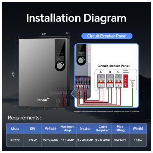 Aquecedor de Água Elétrico Tankless Ranein RE27K Cinza 27 kW 240V Display LED até 65 GPM