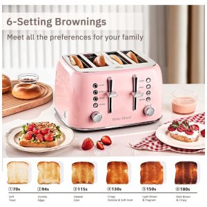 Torradeira Elétrica Retrô 4 Fatias em Aço Inoxidável com Painel de Controle Duplo Independente Bandeja de Migalhas Removível e 6 Níveis de Tostagem 1550W Roter Mond Rosa