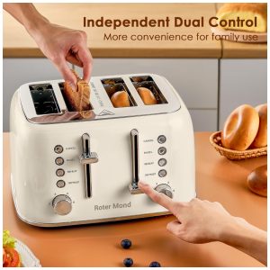Torradeira Elétrica Retrô 4 Fatias em Aço Inoxidável com Painel de Controle Duplo Independente Bandeja de Migalhas Removível e 6 Níveis de Tostagem 1550W Roter Mond Creme