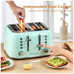 Torradeira Elétrica Retrô 4 Fatias em Aço Inoxidável com Painel de Controle Duplo Independente Bandeja de Migalhas Removível e 6 Níveis de Tostagem 1600W Roter Mond Verde Água