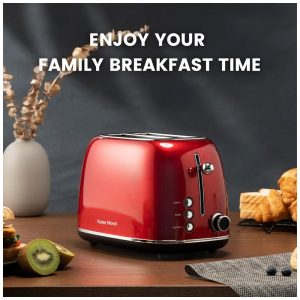 Torradeira Roter Mond 2 Fatias Vermelha Retro Inox 6 Níveis Funções Bagel Descongelar Cancelar Slots Largos Bandeja Removível 110V