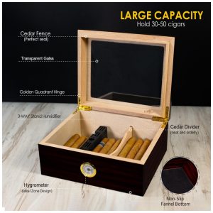 Umidor de Charutos Slege 300g Caixa para Charutos Cubanos Tampa de Vidro e Cedro Espanhol Umidade Controlada Divisória Higrômetro Presente Sofisticado.
