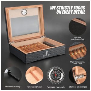 Umidor de Charutos XIFEI com Fibra de Carbono Visor de Vidro e Acessórios Premium – Capacidade para 25-60 Charutos Garantindo Umidade e Estilo