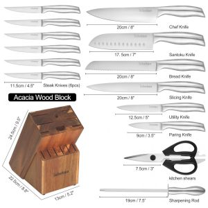 Conjunto de Facas em Aço Inoxidável com Bloco de Bancada e Cabo Ergonômico 15 Peças IsheTao Prata