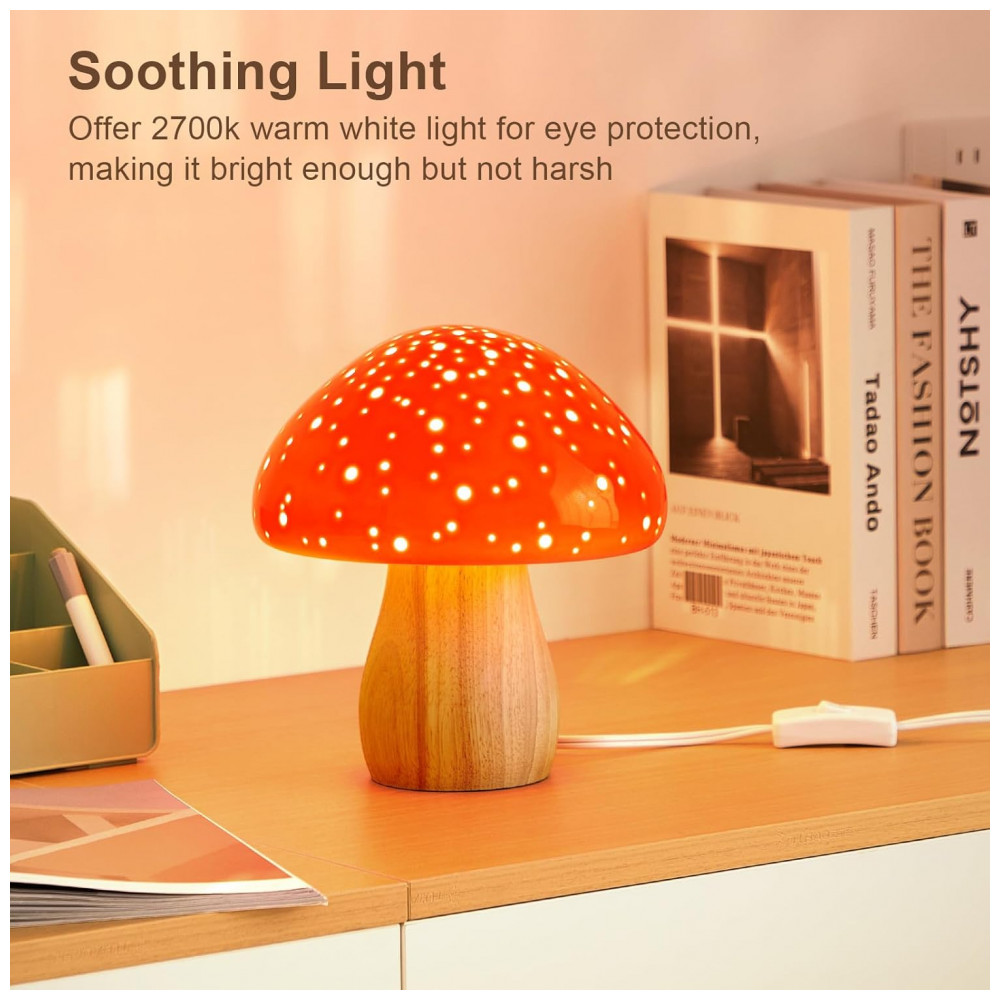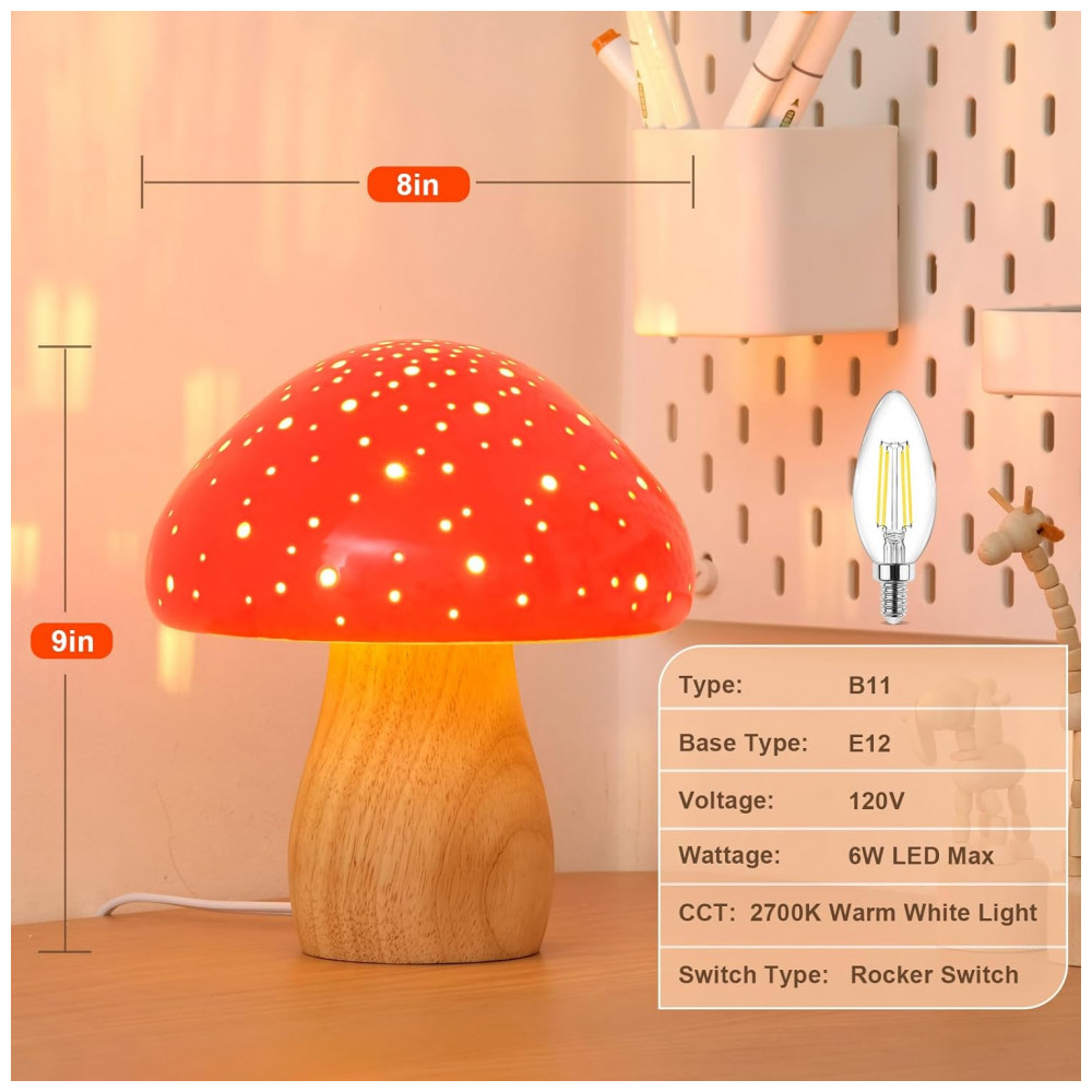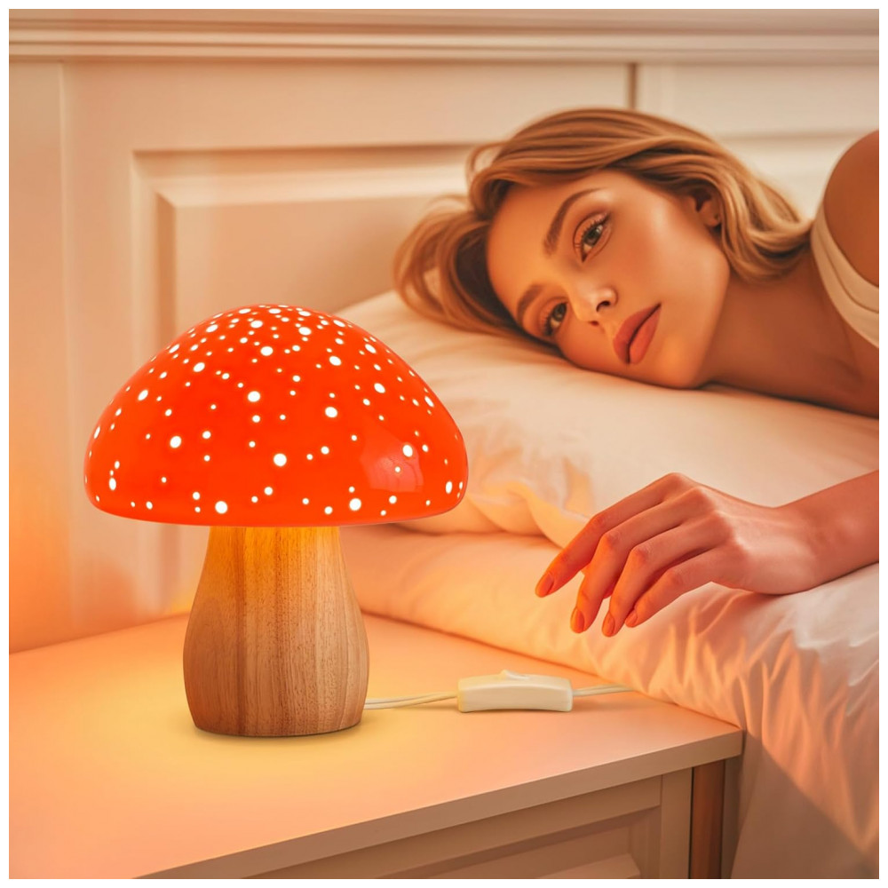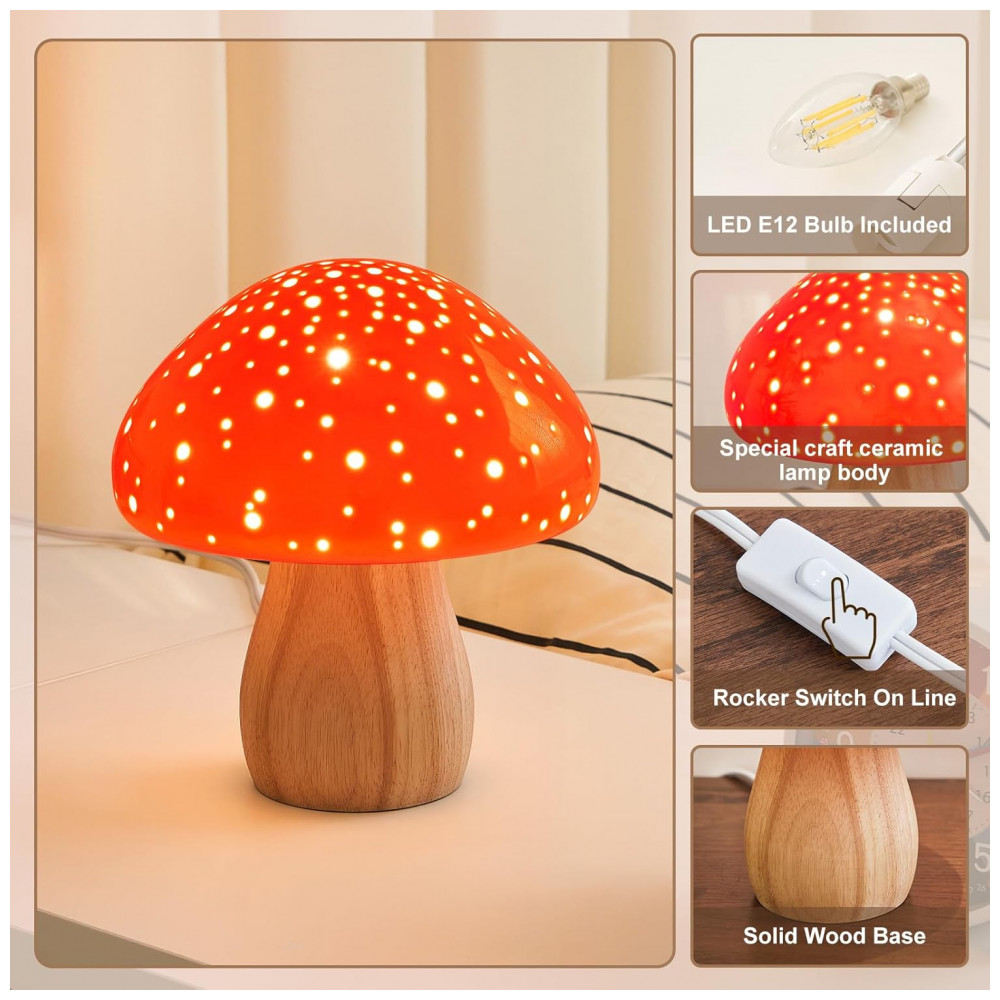 O abajur de mesa BOHON em formato de cogumelo combina cúpula e corpo em cerâmica esmaltada vermelha com base em madeira, criando um ponto de luz compacto para mesas de cabeceira, escrivaninhas e áreas de decoração interna. A peça utiliza lâmpada LED incluída com soquete E12 em tonalidade branco quente 2700 K, que oferece iluminação suave para uso noturno ou iluminação de apoio em dormitório, sala de estar e espaços de estudo.