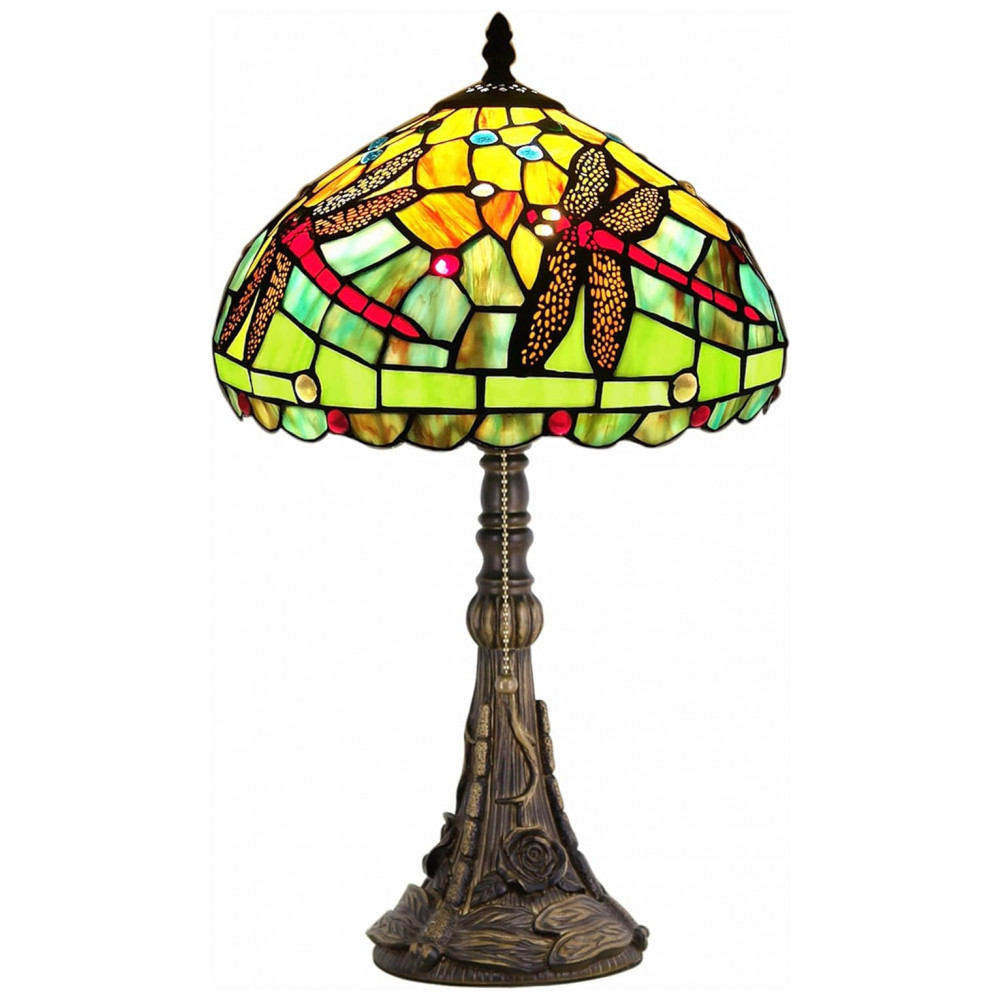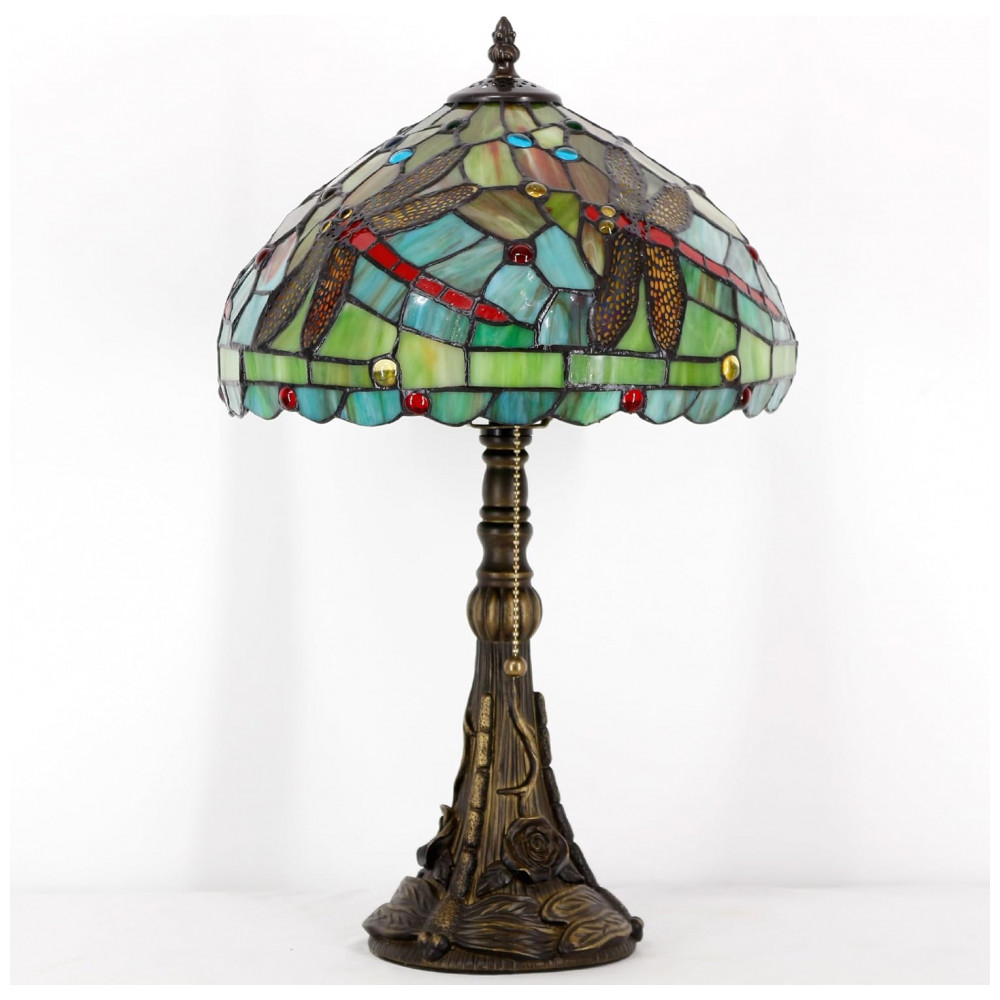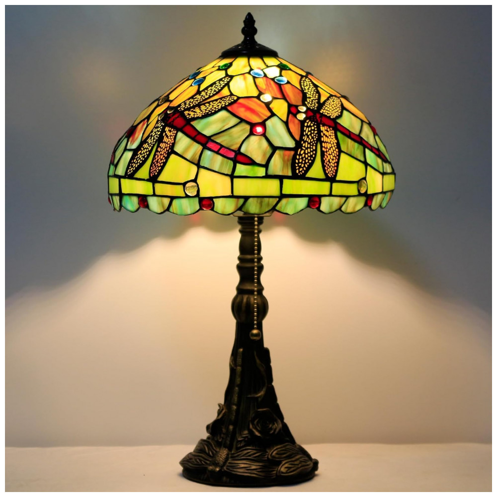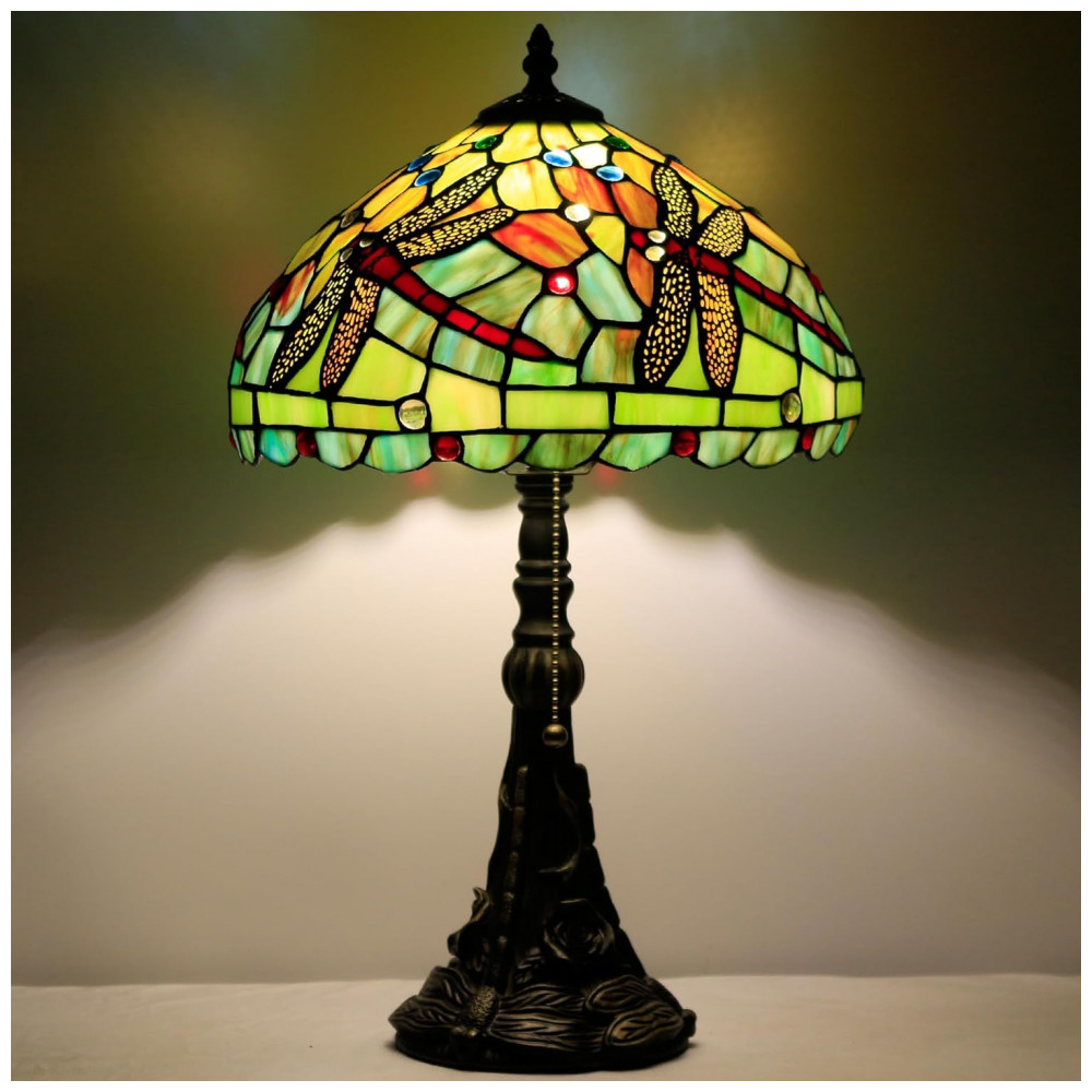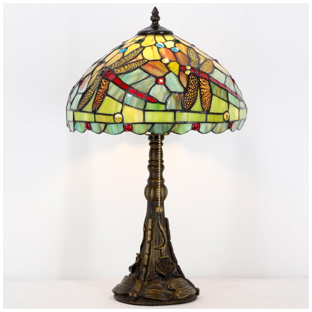 O abajur de mesa ZJART estilo Tiffany combina cúpula em vidro colorido com motivo de libélulas em tons de verde e vermelho com base em resina bronzeada de acabamento antigo, formando uma peça decorativa indicada para ambientes clássicos como sala de estar, quarto e escritório. A cúpula em vidro stained glass é montada em segmentos unidos por estanho, distribuindo uma luz direcionada para baixo adequada para leitura e iluminação de apoio em mesas laterais e criados-mudos.