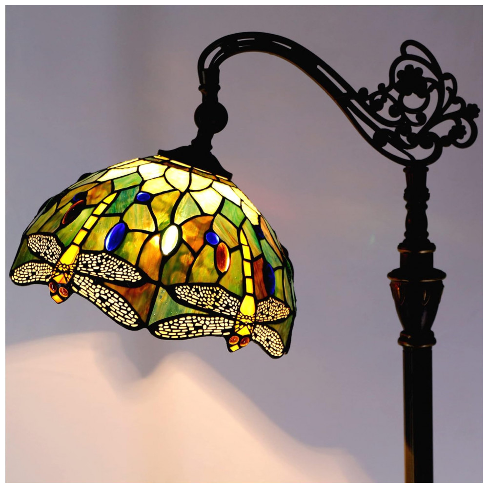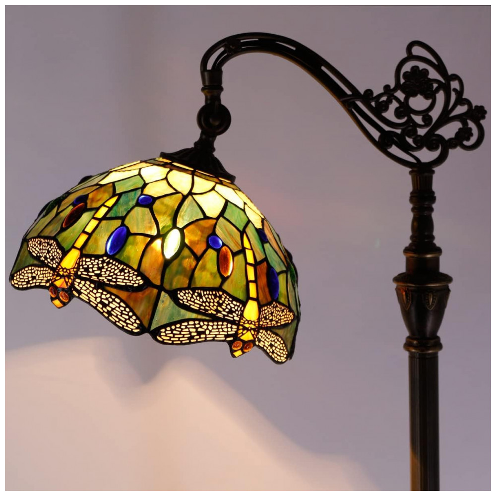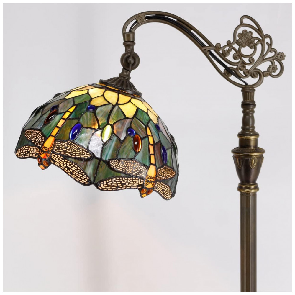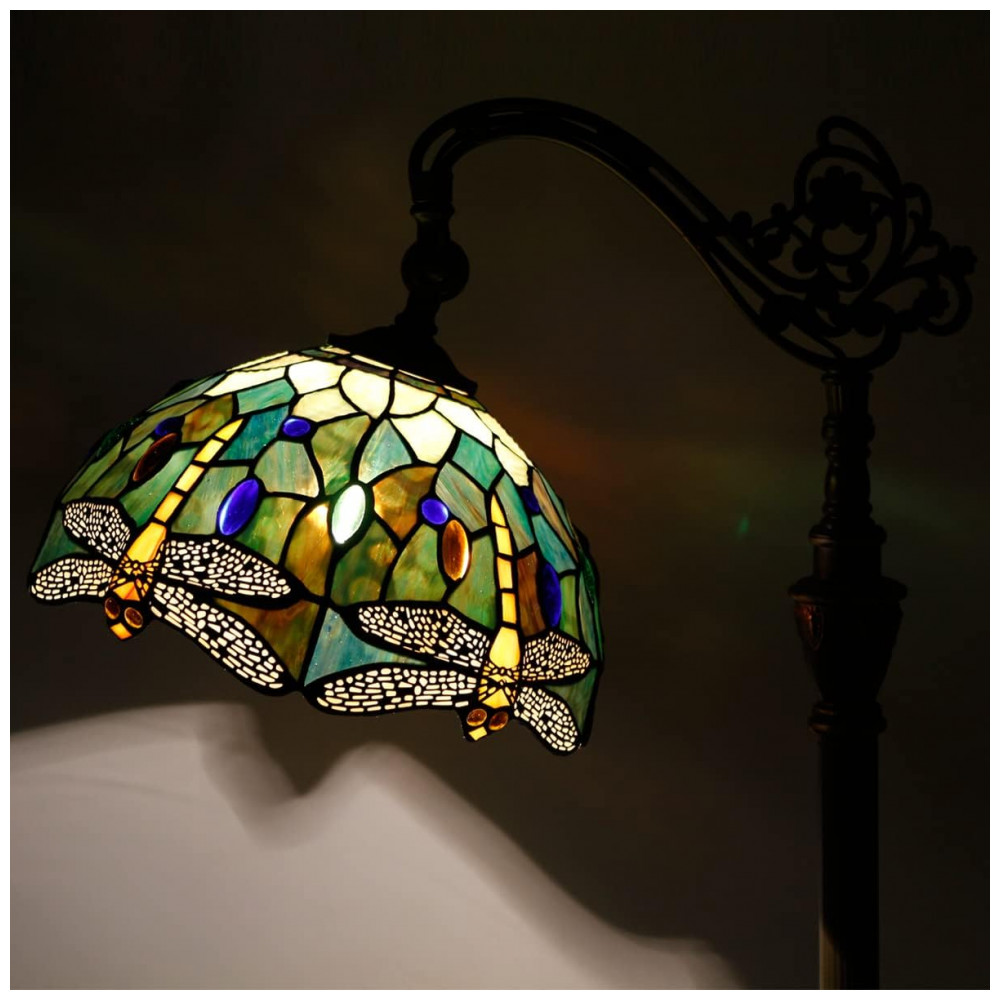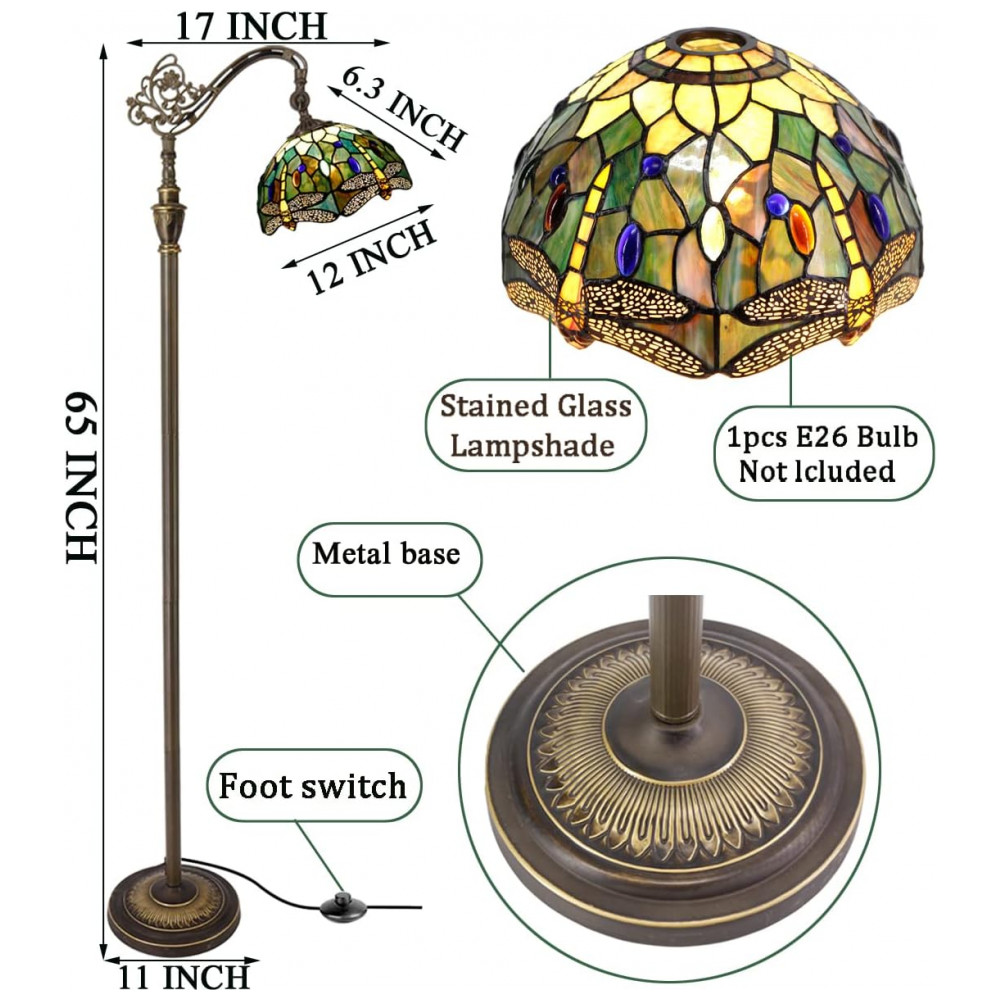 O abajur de piso Tiffany ZJART Amber Yellow Dragonfly é uma luminária de leitura com cúpula em vidro stained glass no padrão libélula em tons de âmbar e amarelo, montada em haste metálica arqueada do tipo gooseneck com regulagem de ângulo do foco de luz. A peça tem cerca de 48 cm de profundidade máxima, 30 cm de largura da cúpula e 170 cm de altura total, com base circular metálica de aproximadamente 28 cm de diâmetro e peso de 9 kg, garantindo boa estabilidade contra tombos.