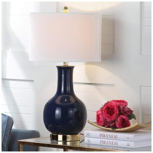 A luminária de mesa Safavieh Lighting Paris é uma peça elegante e sofisticada que adiciona um toque de classe a qualquer ambiente. Seu corpo é confeccionado em cerâmica esmaltada na sofisticada cor azul marinho, complementado por um pescoço e base de metal dourado que realçam o design requintado.