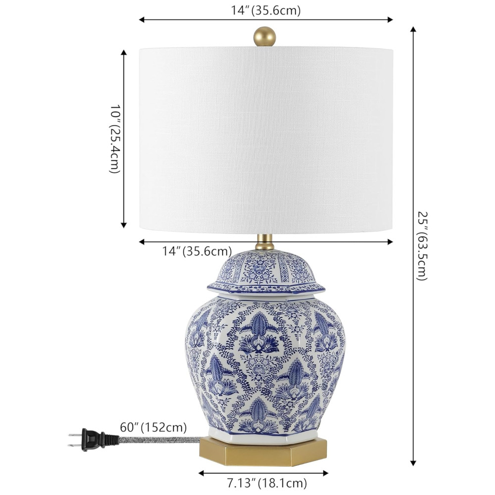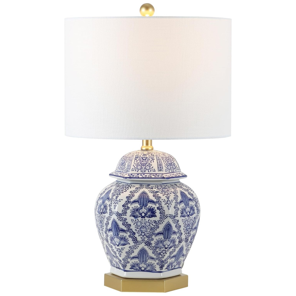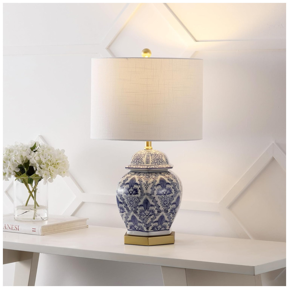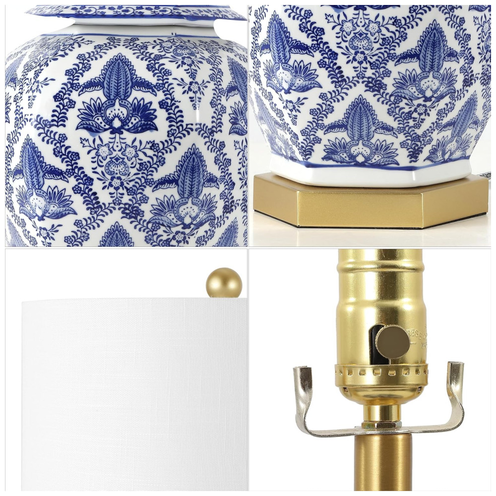 Este abajur de mesa é uma peça elegante e moderna que harmoniza formas geométricas e tradicionais com um design sofisticado. A base hexagonal em latão oferece um toque contemporâneo, enquanto a jarra de gengibre, inspirada na porcelana chinesa, é atualizada com um padrão de damasco azul e branco, trazendo um charme clássico ao design.