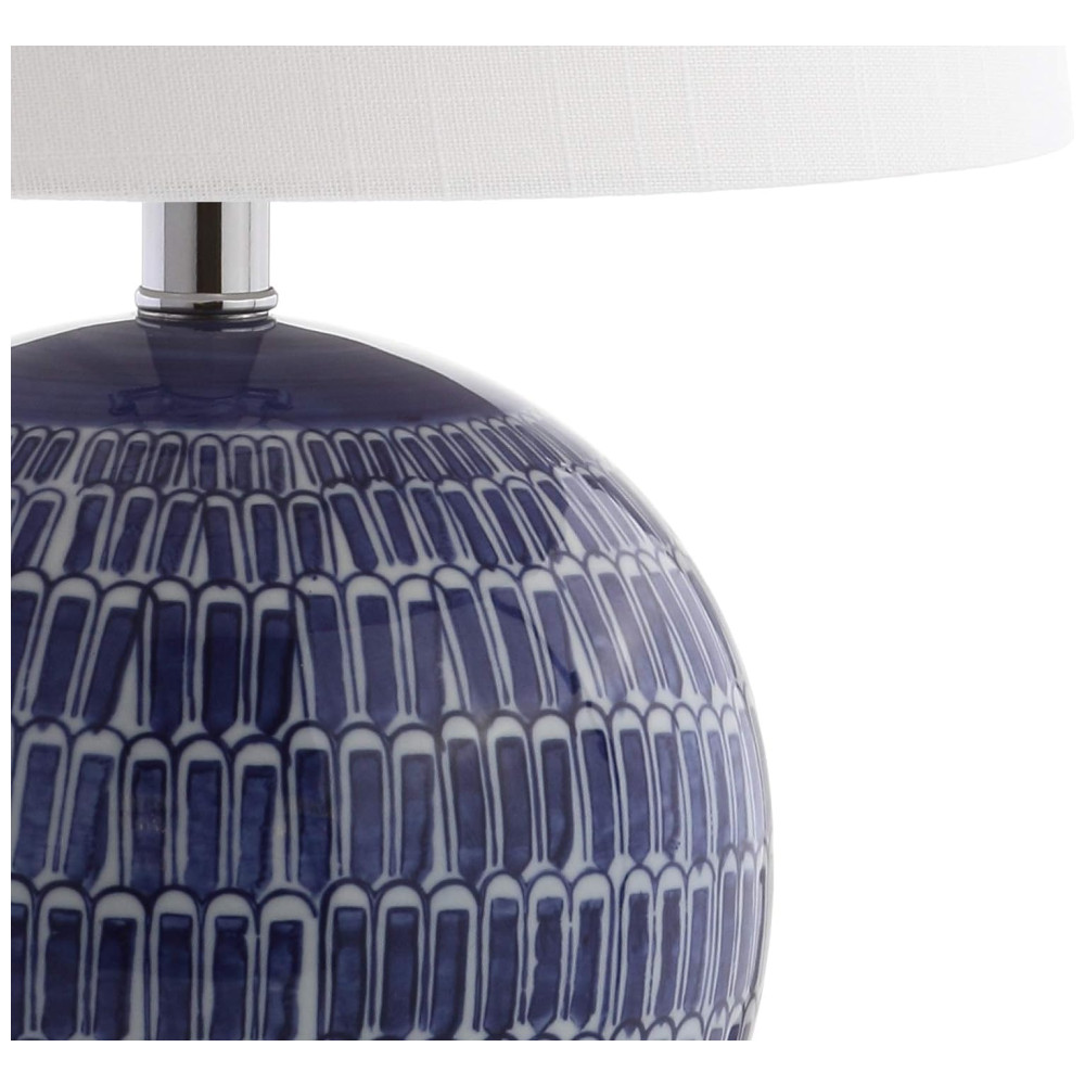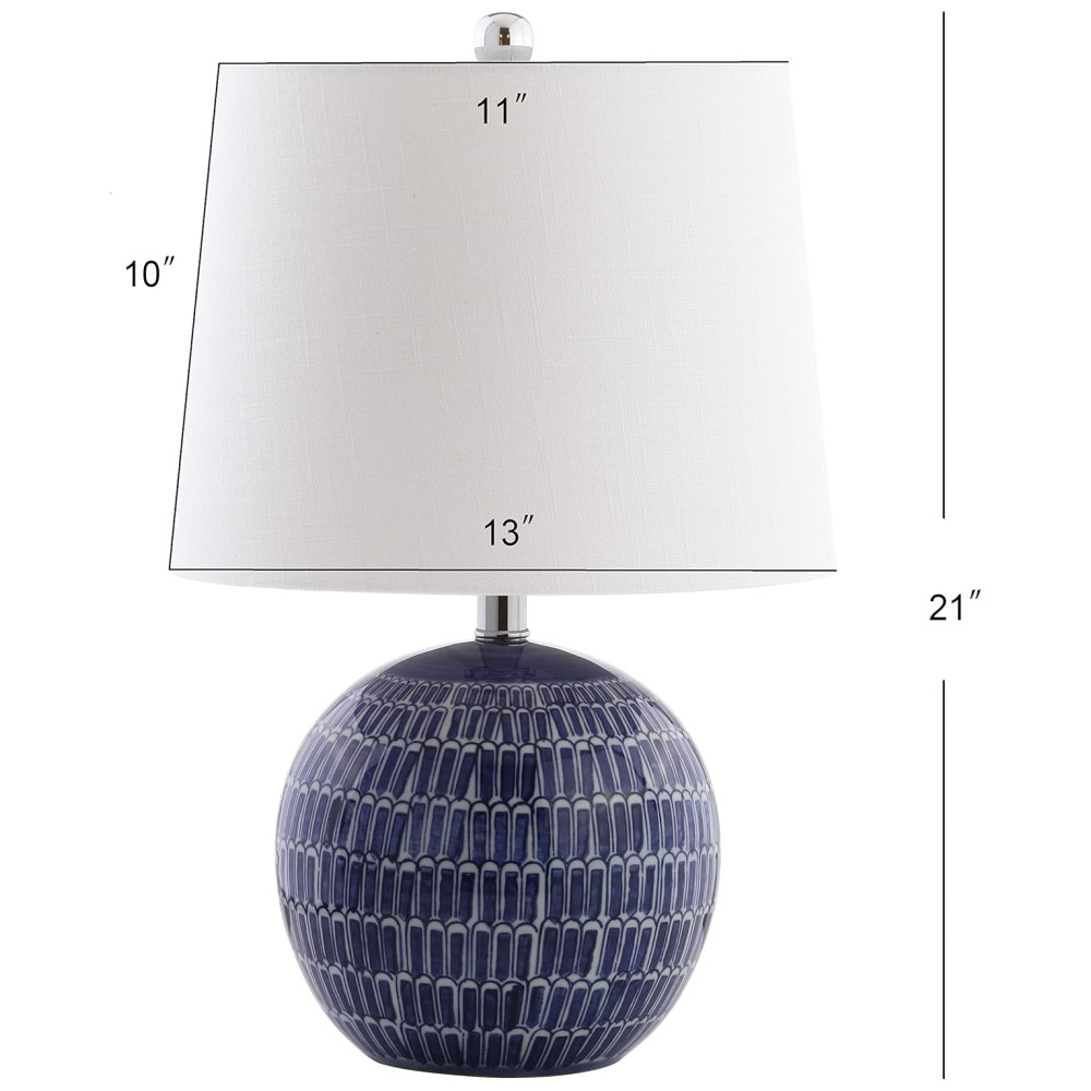 Esta luminária de mesa JONATHAN Y combina um design clássico com um toque moderno. Seu corpo esférico em cerâmica é pintado à mão com um elegante padrão de vieira em índigo, oferecendo um estilo sofisticado e atemporal. A cúpula de tambor ligeiramente cônica complementa a base e é ideal para ser usada em pares, como lâmpadas de destaque em cada lado da cama.